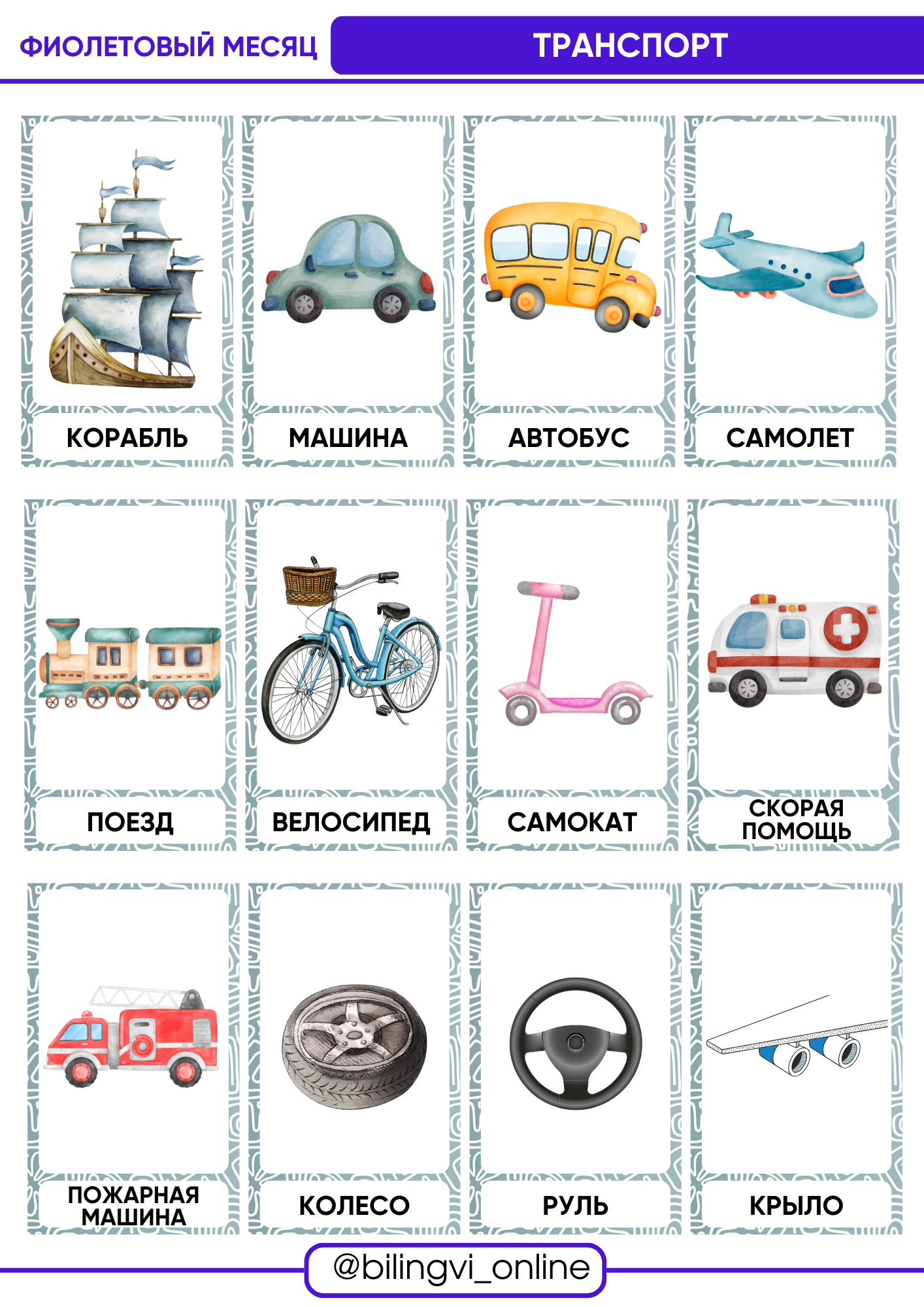 По каждой теме 12 карточек со словами + 4 упражнения на закрепление изученных слов.